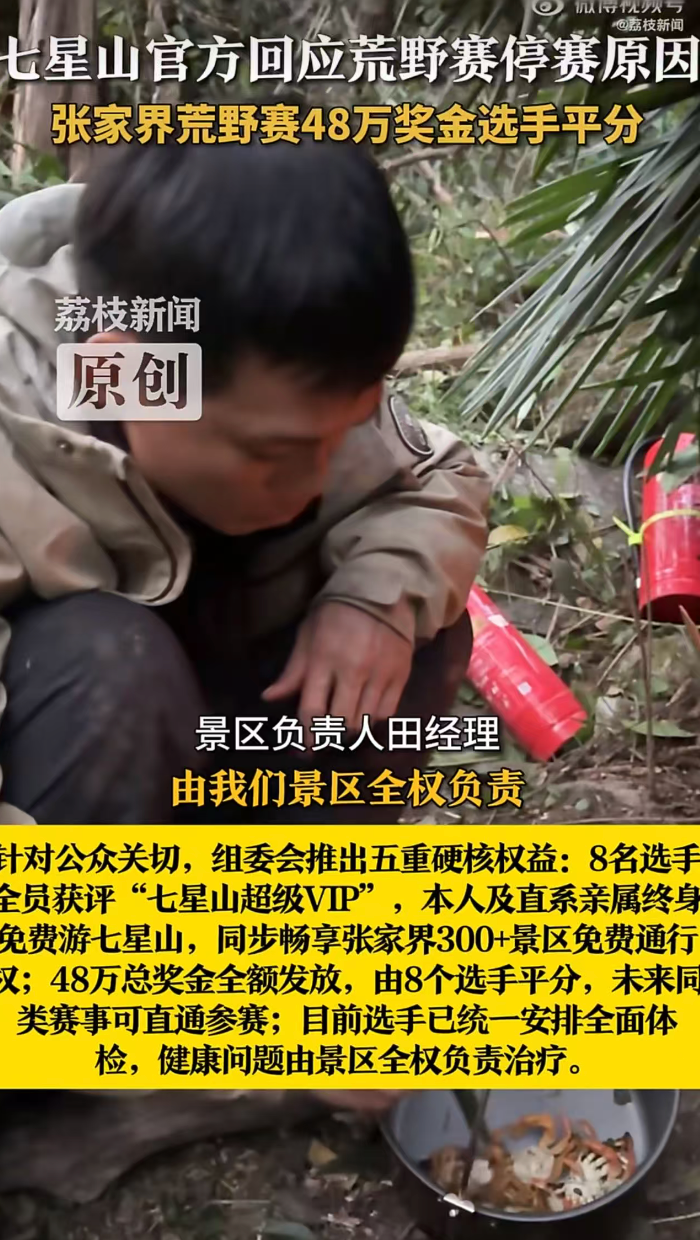 12月11日,张家界七星山“荒野求生”挑战赛组委会在《致张家界七星山荒野求生选手及广大“荒野人”的一封信》中也提到,本赛事以“野外生存时间长短”为核心胜负标准,8名决赛选手已经参加较长时间的竞赛活动,在极端气候条件下,极易导致选手体力过度透支、判断力下降,甚至对身体造成伤害。经组委会慎重会商,决定提前结束第二季张家界七星山“荒野求生”挑战赛。