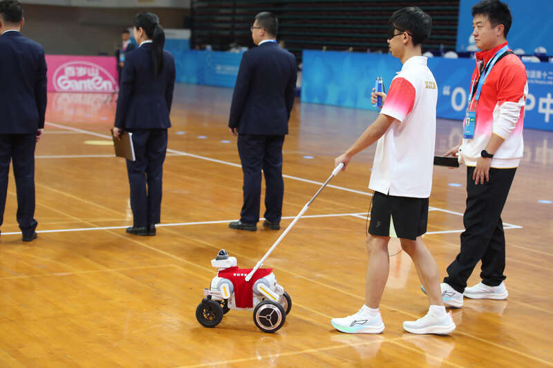 值得一提的是,赛场内智能导盲犬参与赛事保障工作。该设备能精准识别各类障碍物,引导视障运动员从休息室安全顺畅抵达赛场,解决视障群体出行难题。
