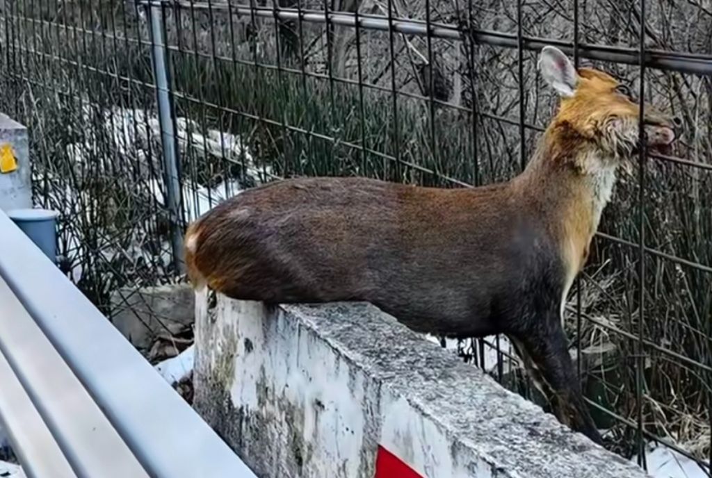 12月10日,一只野生麂子被卡在210国道秦岭段路边围网上,后被解救放生。