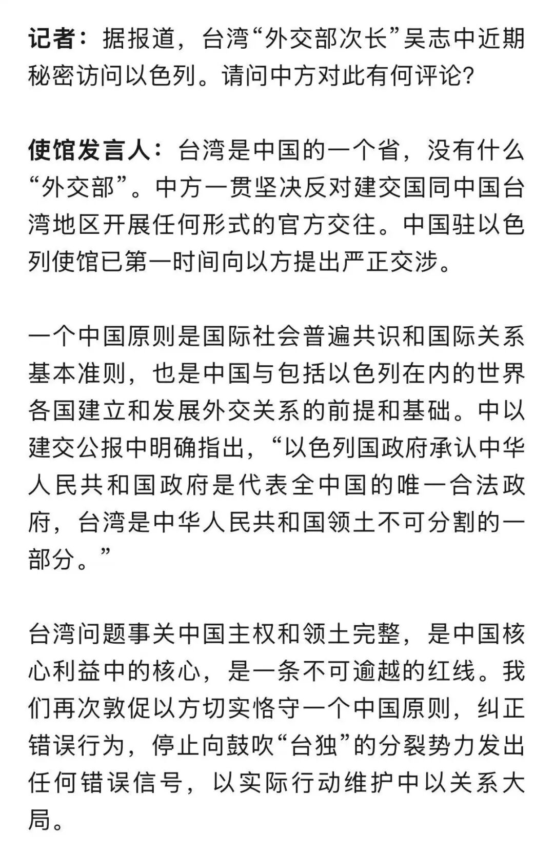 原标题:《中国驻以色列使馆发言人就台湾当局外事部门官员窜以答记者问》