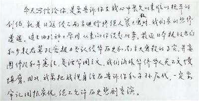 今天写信给你,是要告诉你在我心中长久以来难以抚平的创伤,就是日寇侵占南京进行惨绝人寰大屠杀时,我们家的悲惨遭遇。过去由于种种原因从未向你谈起此事,最近日本执政当局和少数右翼政客极力否认侵华历史和南京大屠杀的事实,并妄图修改和平宪法,复活军国主义,我们海外华侨华人无不义愤填膺。因此,我要把我亲身经历告诉你和子孙后代,一定要牢记国恨家仇,绝不允许历史悲剧重演。