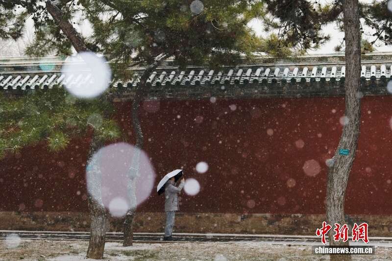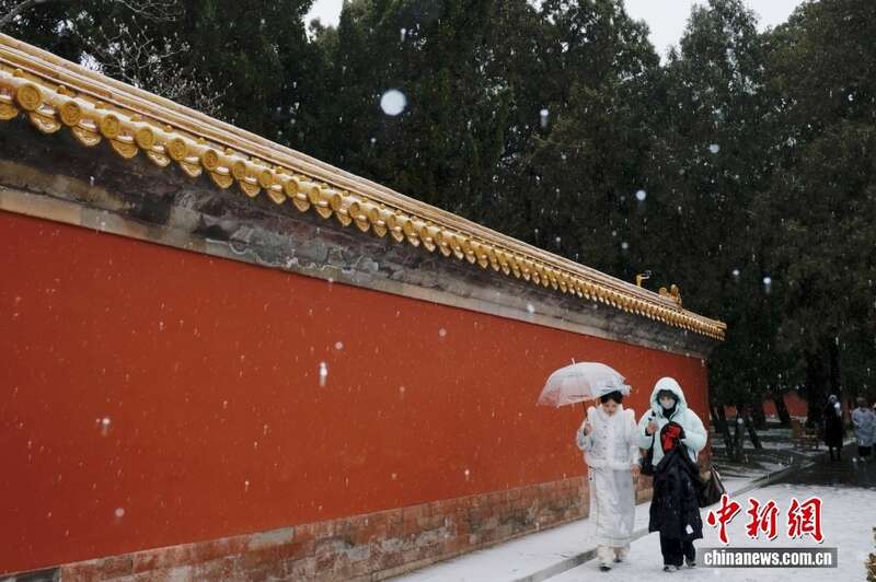 12月12日,北京城区出现明显降雪,市民在北京地坛公园内游览、赏雪。图为游客在地坛公园的红墙边拍照留念。