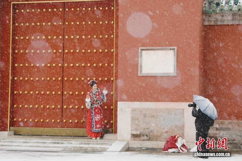 12月12日,北京城区出现明显降雪,市民在北京地坛公园内游览、赏雪。图为游客在地坛公园拍照。
