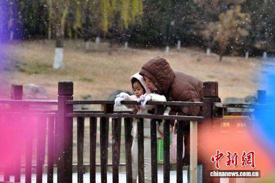 12月12日,北京城区出现明显降雪,市民在北京地坛公园内游览、赏雪。图为儿童在地坛公园玩耍。