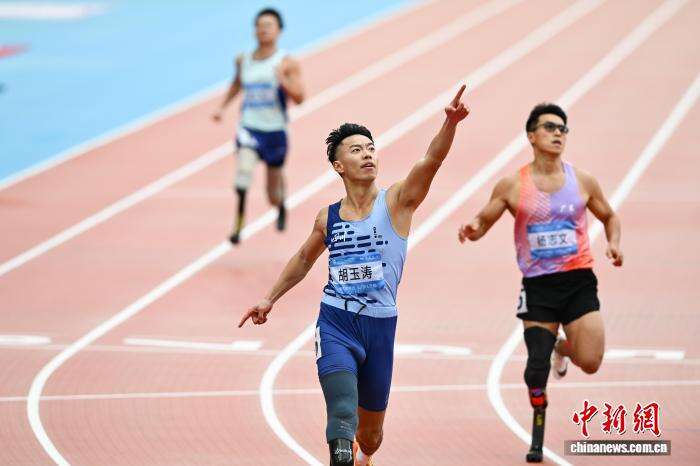 12月13日,全国第十二届残疾人运动会暨第九届特殊奥林匹克运动会田径项目在位于广州的广东奥林匹克体育中心继续开展,在男子200米T64级决赛中胡玉涛夺冠。图为胡玉涛冲线时庆祝。中新社记者 陈楚红 摄