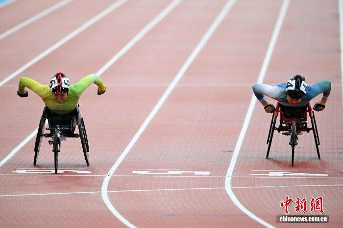 12月13日,全国第十二届残疾人运动会暨第九届特殊奥林匹克运动会田径项目在位于广州的广东奥林匹克体育中心继续开展,在女子200米T53级决赛中周洪转夺冠。图为周洪转(左)奋力冲线。中新社记者 陈楚红 摄
