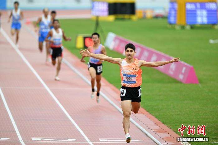 12月13日,全国第十二届残疾人运动会暨第九届特殊奥林匹克运动会田径项目在位于广州的广东奥林匹克体育中心继续开展,在男子800米T38级决赛中阿布都拉·吐洪江夺冠。图为阿布都拉·吐洪江到达终点时张开双臂庆祝。中新社记者 陈楚红 摄
