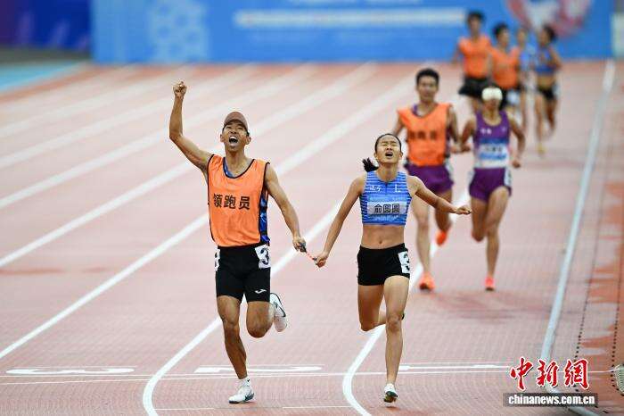 12月13日,全国第十二届残疾人运动会暨第九届特殊奥林匹克运动会田径项目在位于广州的广东奥林匹克体育中心继续开展,在女子800米T12级决赛中俞圆圆夺冠。图为俞圆圆(右一)和领跑员冲刺终点时握拳庆祝。中新社记者 陈楚红 摄