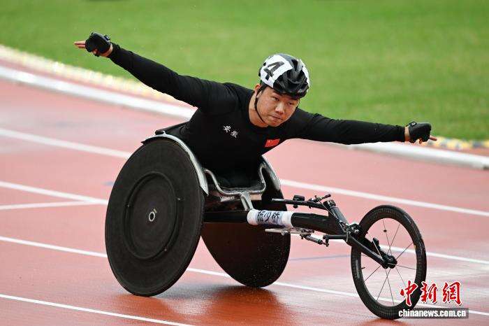 12月13日,全国第十二届残疾人运动会暨第九届特殊奥林匹克运动会田径项目在位于广州的广东奥林匹克体育中心继续开展,杨少桥在男子200米T53级决赛中夺冠。图为杨少桥冲线后展开双臂庆祝。中新社记者 陈楚红 摄