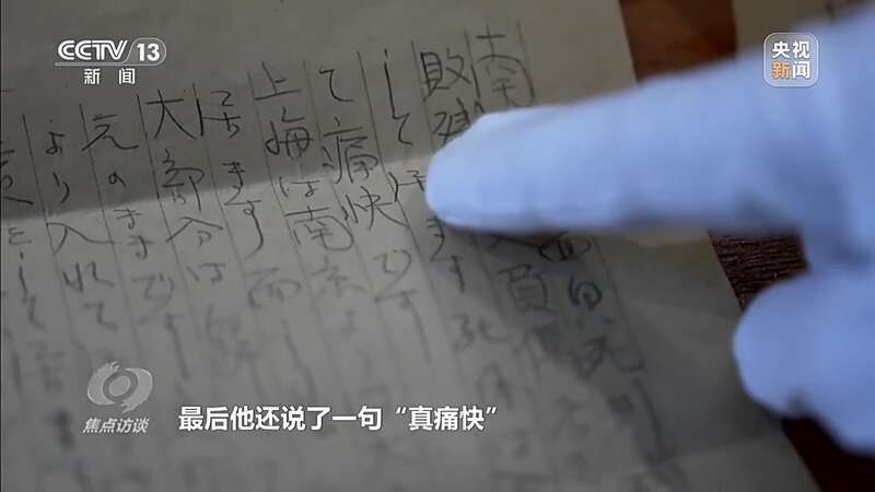 侵华日军南京大屠杀遇难同胞纪念馆文物部工作人员 蒋俊:这封信总共有4页,在第2页写着,南京有一个死刑栈桥,每天用日本刀刺杀或者射杀,把尸体丢到扬子江中。最后他还说了一句“真痛快”,完全就是一种没有人性的表述,非常残忍。