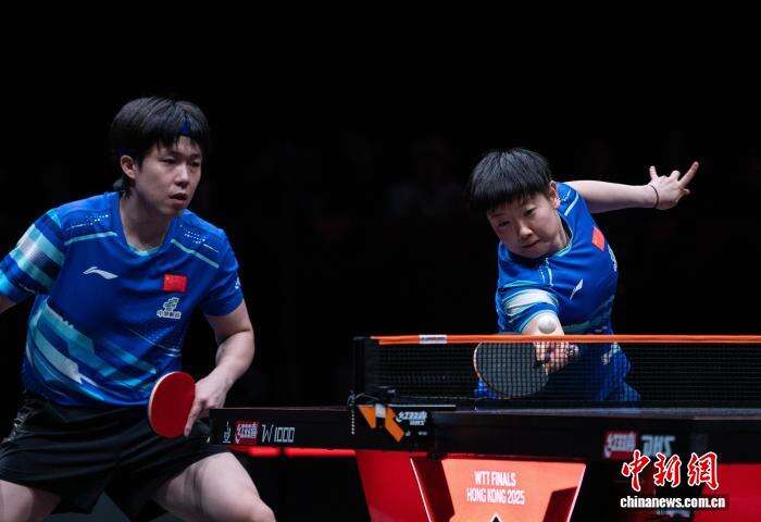 12月13日晚,世界乒乓球职业大联盟(WTT)香港总决赛混双决赛在香港体育馆举行,中国组合王楚钦/孙颖莎以0:3不敌韩国组合林钟勋/申裕斌,获得亚军。图为孙颖莎(右)和王楚钦在比赛中回球。 中新社记者 侯宇 摄