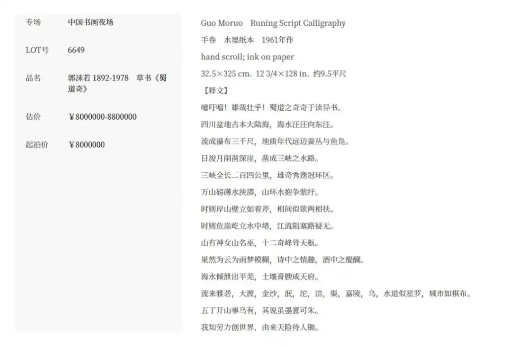 近日,郭沫若书法手卷《蜀道奇》将亮相北京保利二十周年秋拍,12月16日开拍,起拍价800万元。其女郭庶英委托律师发布声明,称该作品为父亲1961年题赠自己的私藏,从未转让或授权,目前已遗失并报警,质疑拍卖为无权处分,要求保利中止拍卖、返还作品。