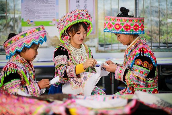 2025年12月16日,贵州黔西,太来彝族苗族乡院子小学的学生在民间刺绣艺人指导下学习刺绣技艺。图片来源:视觉中国
