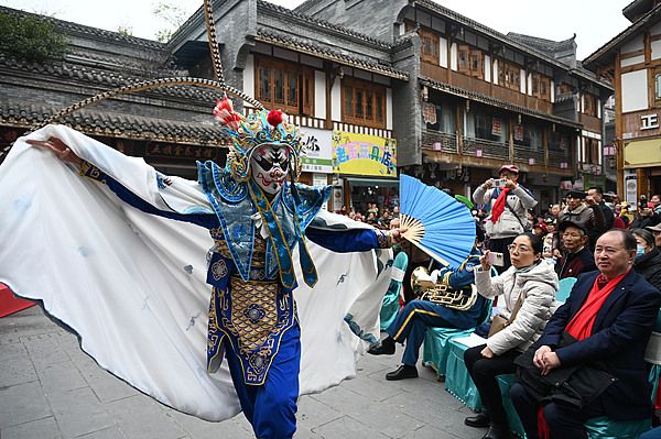 2025年12月16日,四川内江,川剧演员为群众表演川剧绝活“变脸吐火”。