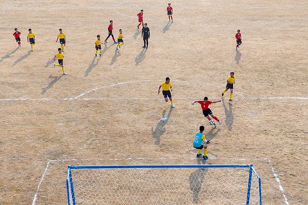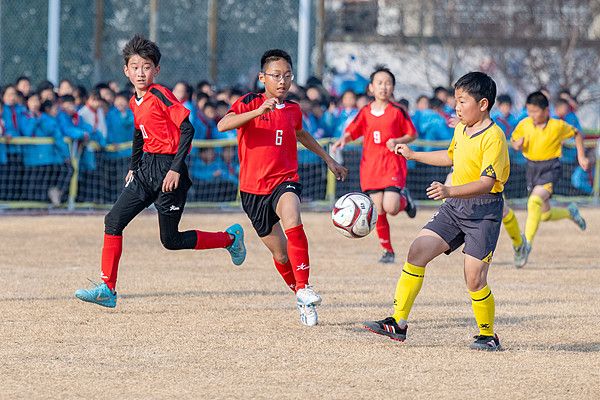 2025年12月18日,浙江湖州,长兴县夹浦镇中心小学运动场,夹浦镇中心小学和太湖图影小学的学生参与校园足球邀请赛。