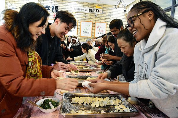 2025年12月19日,江苏镇江,几名江苏大学的外国留学生在迎江路中心社区包饺子,体验民俗。
