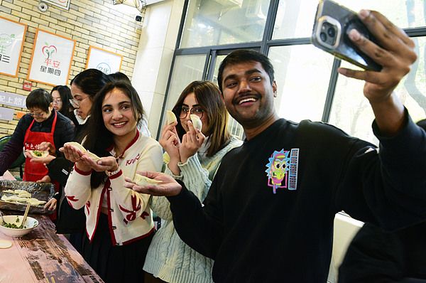 2025年12月19日,江苏镇江,江苏大学的外国留学生与居民一起展示包好的饺子。