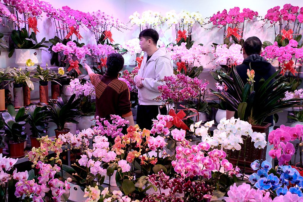 2025年12月19日,辽宁省沈阳市,北市花卉市场,各家商铺、摊位都摆放着五彩斑斓的年宵鲜花,花香四溢,吸引不少市民前来购买鲜花。