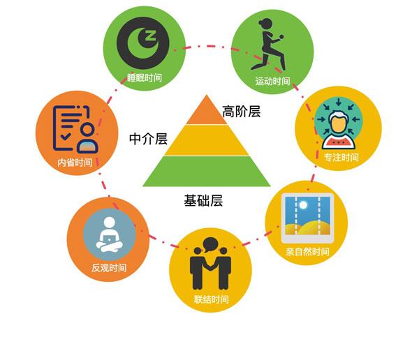 在“七时间模型”中,一天24小时划分为七种时间体验类型:睡眠时间、运动时间、专注时间、亲自然时间、联结时间、反观时间、内省时间。