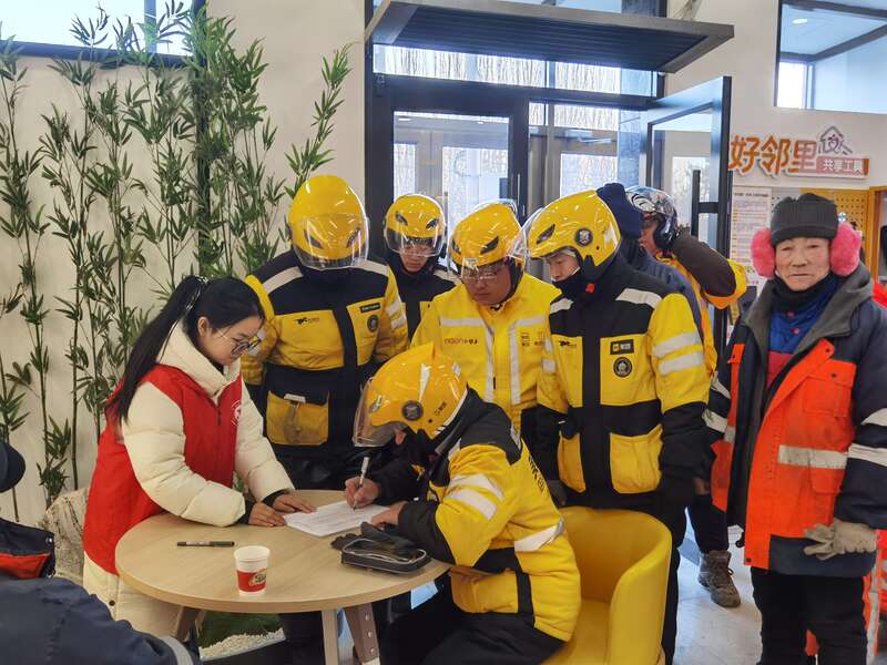 在青山万达广场东门的服务站点,同样是一派热闹景象。伴随着“您辛苦了”“天冷路滑,注意安全”等妥帖叮嘱,志愿者们将一份份饺子、一杯杯热茶递到户外劳动者手中。