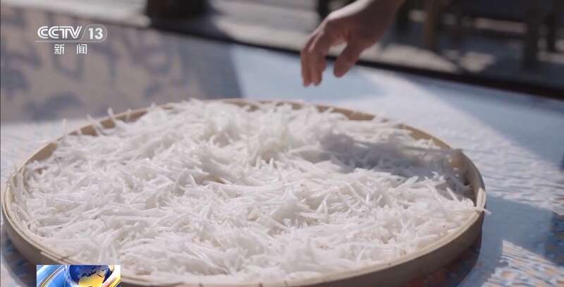 萝卜带回家后,用刨丝器擦成丝,随后摊放在竹匾进行自然风干。在冬日暖阳下,醇厚的香味也被锁在丝丝缕缕的金黄里。