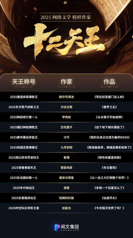 中国青年报客户端讯(中青报·中青网记者 沈杰群)12月24日,2025网络文学榜样作家“十二天王”名单发布。12位作家的作品涵盖玄幻、都市、科幻、仙侠、轻小说、奇幻等多元题材。
