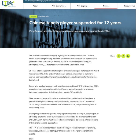 此次公告并非孤例。仅2025年至今,ITIA已公布全球范围内54名网球运动员及官员涉及腐败事件。其中,亦有中国网球运动员卷入其中。ITIA上月曾公告,三名中国球员因违反TACP而被制裁:21岁的李文夫(职业生涯最高世界单打排名1572名)、张瑾(职业生涯最高世界单打排名1285名)承认收受贿赂操纵比赛,分别被禁赛两年零三个月、罚款2万美元,和禁赛两年、罚款15000美元;23岁的陆鹏宇(职业生涯最高世界单打排名896名)则还在接受审议,被暂时禁赛。