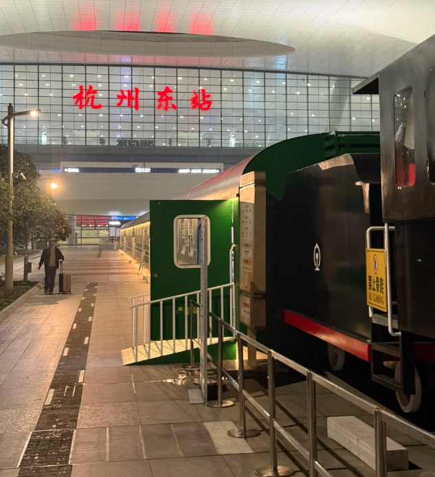 据杭州东站枢纽管理委员会工作人员介绍,这列露天停靠在杭州东站东广场的绿皮火车,不仅是拍照打卡的复古背景,更是向旅客提供夜间躺睡的地方。