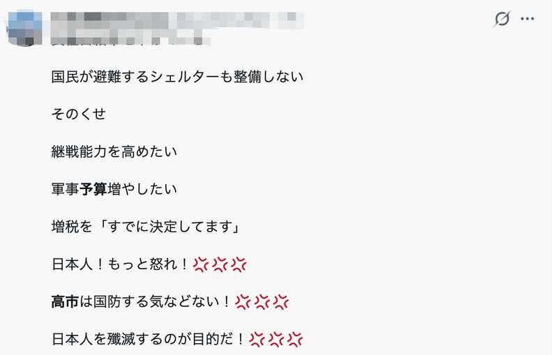 还有日本网友对预算中的高防卫支出怒不可遏:“对粮食自给率一降再降,连国民避难用的收容所都不肯修建,可偏偏一门心思要提升持续作战能力,一门心思要增加军事预算,增税这件事还大言不惭地说‘早就定好了’。日本民众,给我更愤怒一点!高市根本就没有保卫国家的打算!他们的目的就是要把日本民众赶尽杀绝!”
