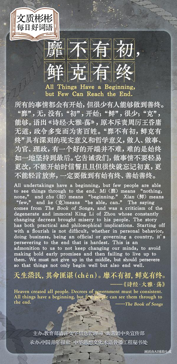 所有的事情都有开始,但很少有人能够做到善终。“靡”,无,没有;“初”,开始;“鲜”,很少;“克”,能够。语出《诗经·大雅·荡》,原意为斥责周厉王昏庸无道,政令多变而为害百姓。“靡不有初,鲜克有终”具有深刻的现实意义和哲学意义,做人、做事、为官、理政,有一个好的开端并不难,难的是始终如一地坚持到最后。它告诫我们,做事情不要轻易更改,不能开始时信誓旦旦但很快就忘记初衷,更不能轻言放弃,一定要做到有始有终、善始善终。