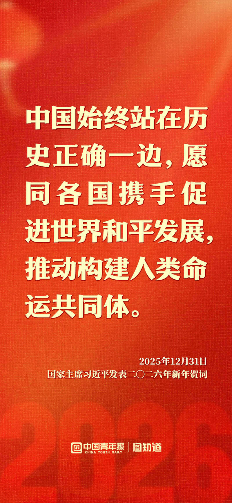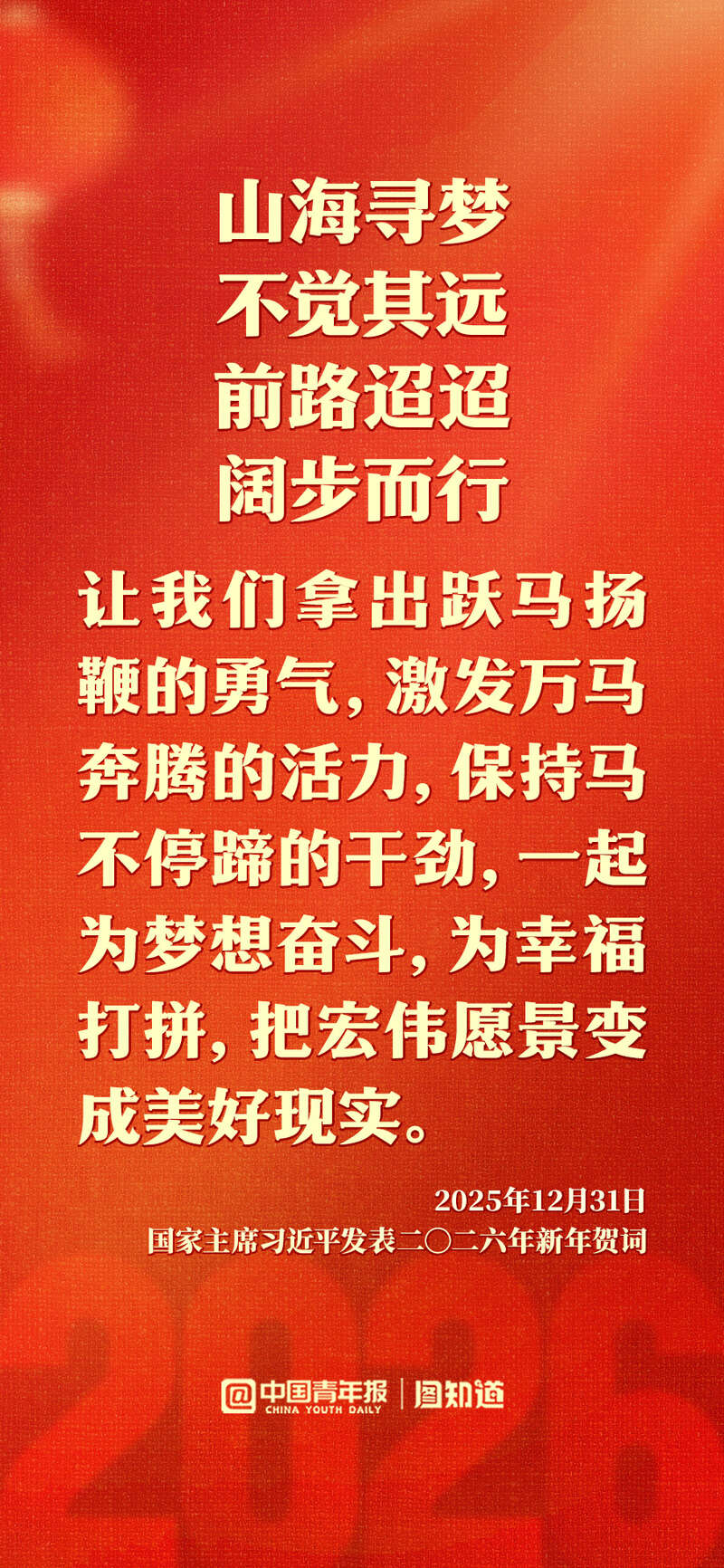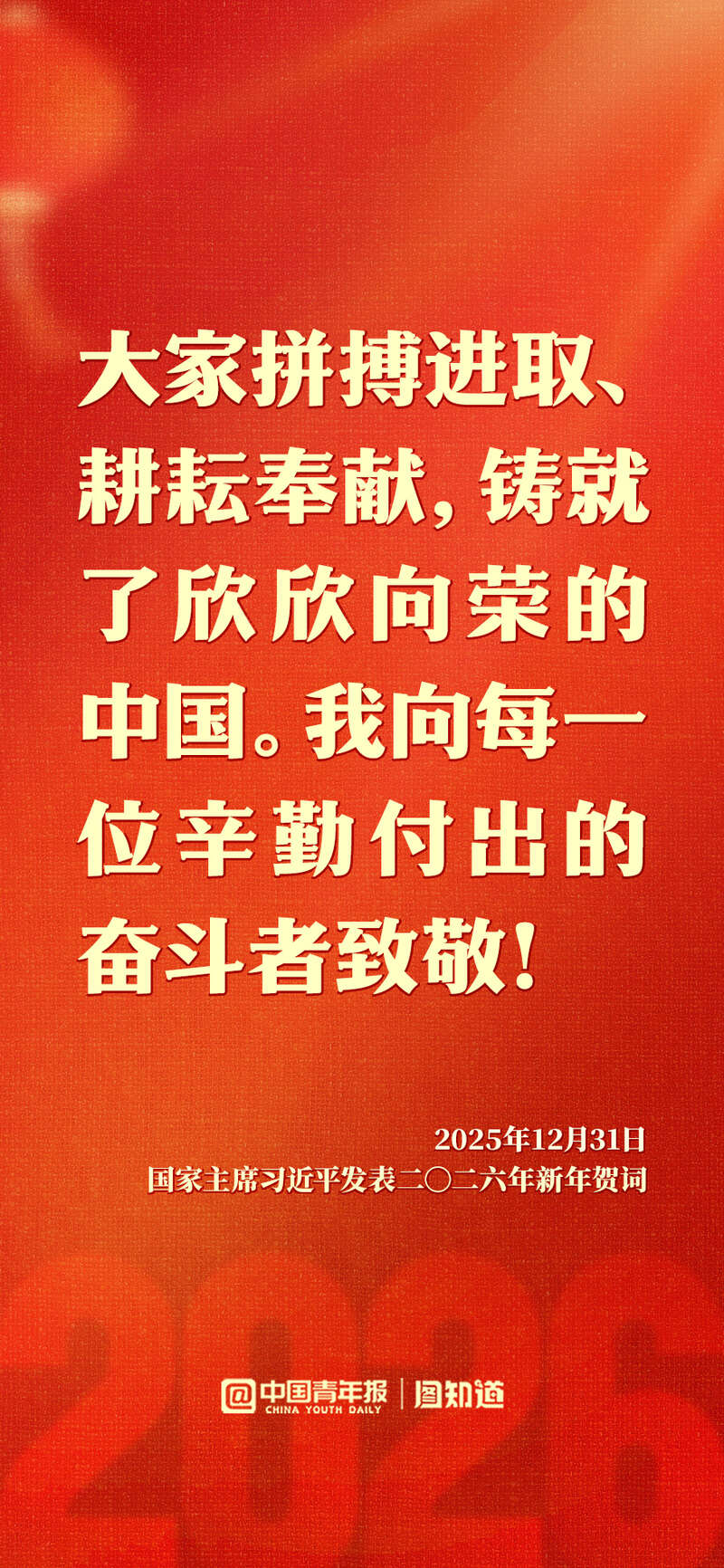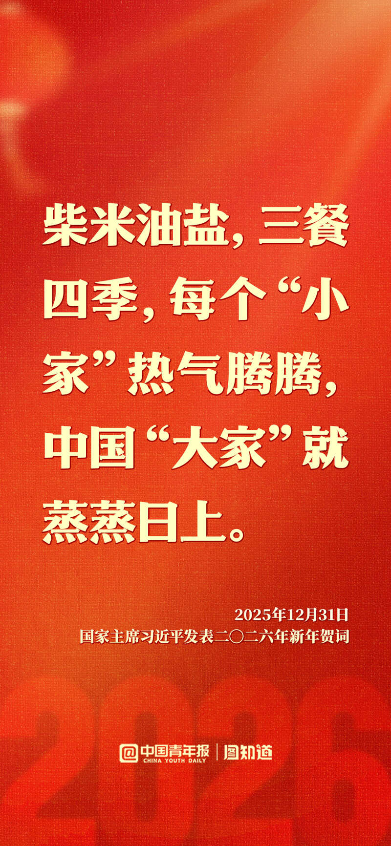 新年前夕,国家主席习近平发表二〇二六年新年贺词。“每个‘小家’热气腾腾,中国这个‘大家’就蒸蒸日上。”家国共此时,让我们带着这份温暖与力量,携手奔赴2026。