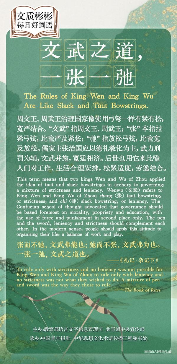 This term means that two kings Wen and Wu of Zhou applied the idea of taut and slack bowstrings in archery to governing: a mixture of strictness and leniency. Wenwu refers to King Wen and King Wu of Zhou; zhang taut bowstring, or strictness; and chi slack bowstring, or leniency. The Confucian school of thought advocated that governance should be based foremost on morality, propriety and education, with the use of force and punishment in second place only. The pen and the sword, leniency and strictness should complement each other. In the modern sense, people should apply this attitude to organizing their life: a balance of work and play.