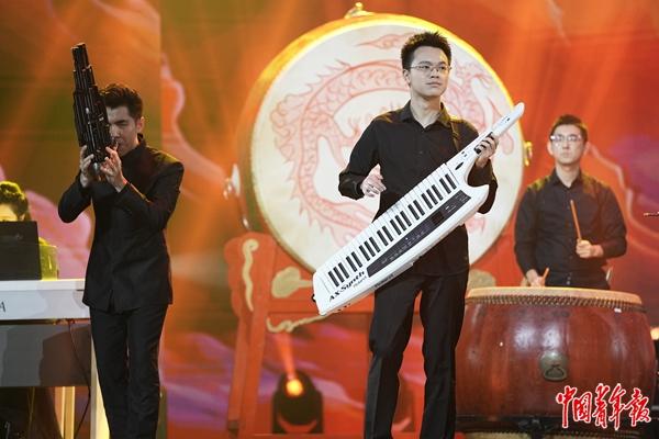 2025年12月27日,北京大学百周年纪念讲堂,2025“非遗焕新”青年文化主题活动现场,中国人民大学学生艺术团和原中国人民解放军空军政治部文工团团长张天宇表演的《国潮·智韵和鸣》。中青报·中青网记者 李隽辉/摄