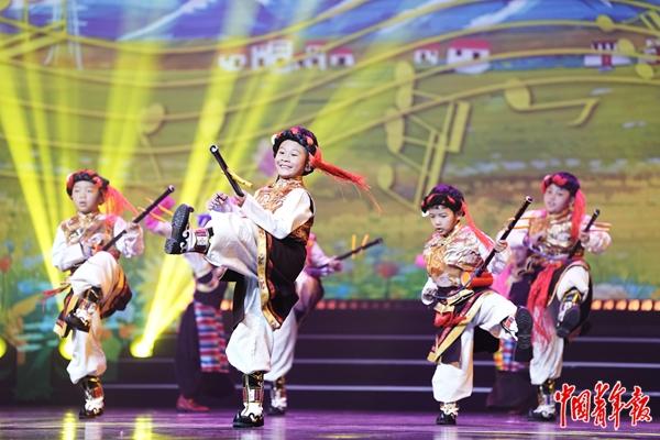 2025年12月27日,北京大学百周年纪念讲堂,2025“非遗焕新”青年文化主题活动现场,西藏大学学生曲英措和西藏雪莲花艺术团表演的藏族传统舞蹈《弦歌·雪域流光》。中青报·中青网记者 李隽辉/摄