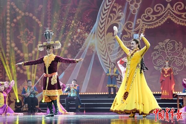 2025年12月27日,北京大学百周年纪念讲堂,2025“非遗焕新”青年文化主题活动现场,新疆莎车县十二木卡姆歌舞团表演节目《欢歌·天山此时》。中青报·中青网记者 李隽辉/摄