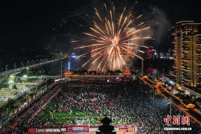 图为1月2日晚,航拍贵州“村超”烟花秀。记者 瞿宏伦 摄