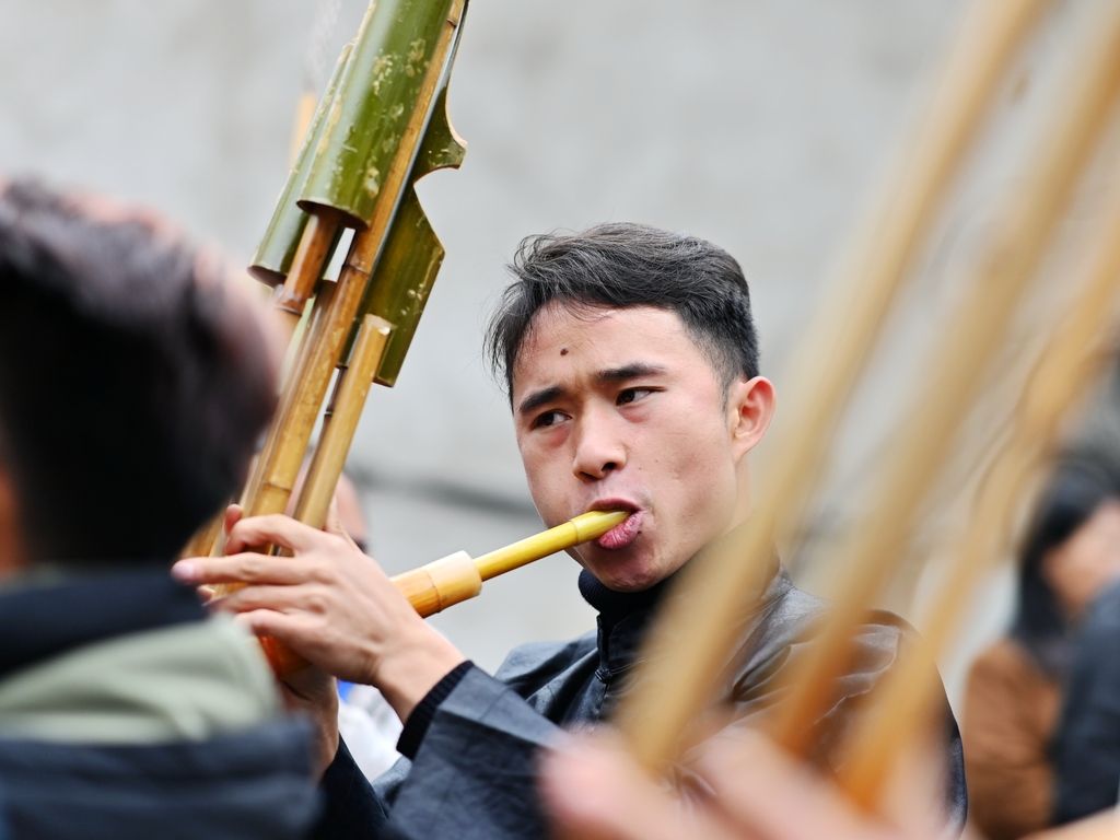 2026年1月5日,广西融水,当地村民吹奏芦笙庆祝传统的芦笙“砍旗节”。