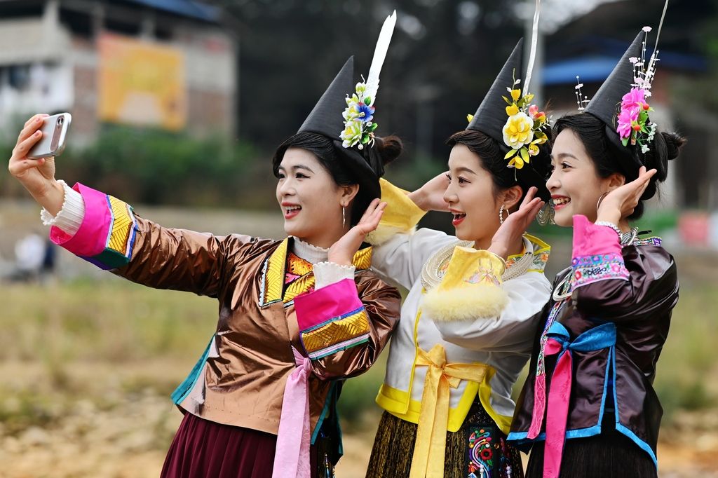 2026年1月5日,广西融水,苗族姑娘在芦笙“砍旗节”活动上合影。