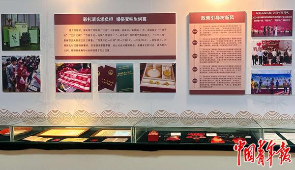 宁夏吴忠利通区牛家坊村民俗文化馆内,相关展品和文字图片呈现了高额彩礼给村民生活带来的负担,并展示当地推进移风易俗的相关政策。中青报·中青网记者 焦敏龙/摄
