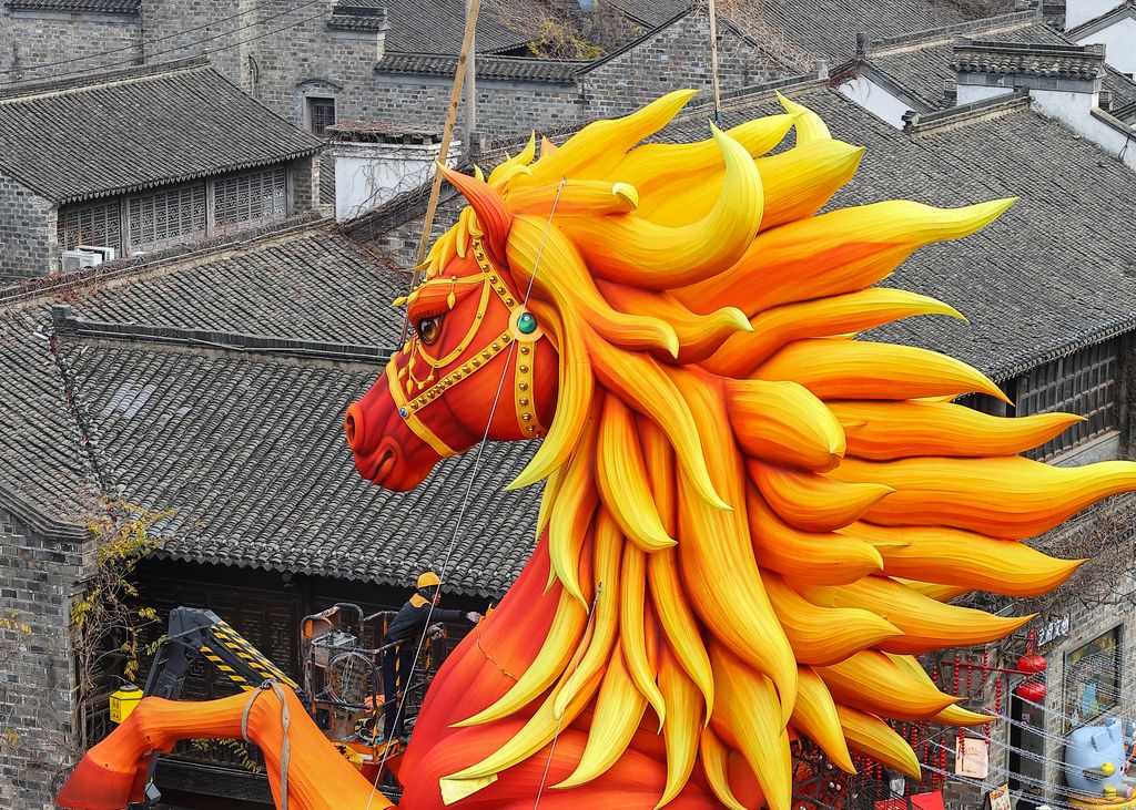 2026年1月6日,江苏南京,工作人员在文化街区内安装大型灯彩,迎接农历马年。