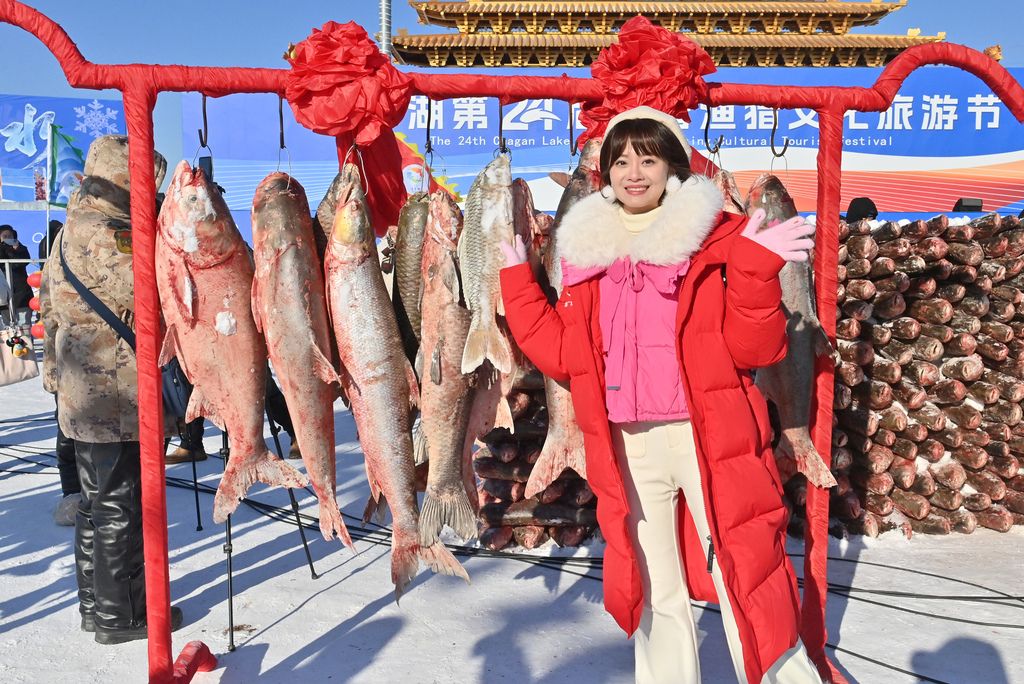 2026年1月8日,吉林松原查干湖第24届冰雪渔猎文化旅游节开幕,数万名中外游客齐聚冰湖,见证冬捕奇观。图为游客与鱼合影。 中新社记者 张瑶 摄