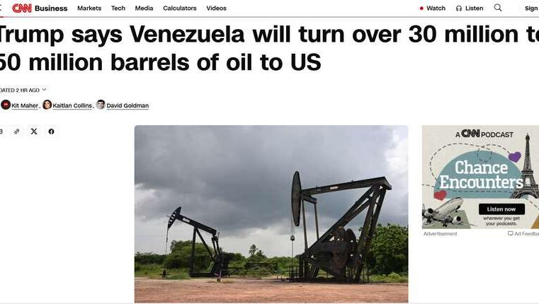 特朗普称委内瑞拉将向美国移交3000万至5000万桶石油