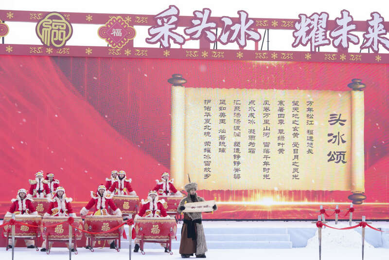 2025年12月7日,第六届哈尔滨采冰节在松花江畔开幕,精彩的采冰仪式和民俗体验互动吸引众多市民和游客参与其中。这是采冰节现场的民俗表演。