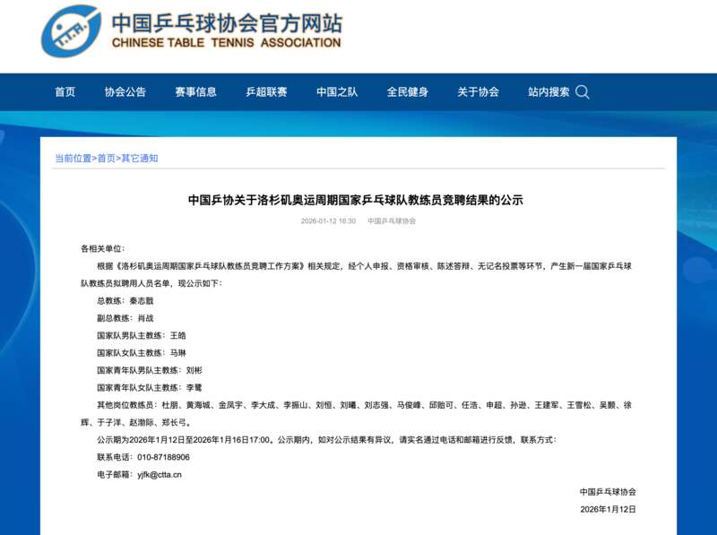 中国青年报客户端北京1月12日电(中青报·中青网记者慈鑫)中国乒乓球协会官网今天下午公示洛杉矶奥运周期国家乒乓球队教练员竞聘结果。中国乒乓球协会拟聘秦志戬为总教练,拟聘肖战为副总教练。
