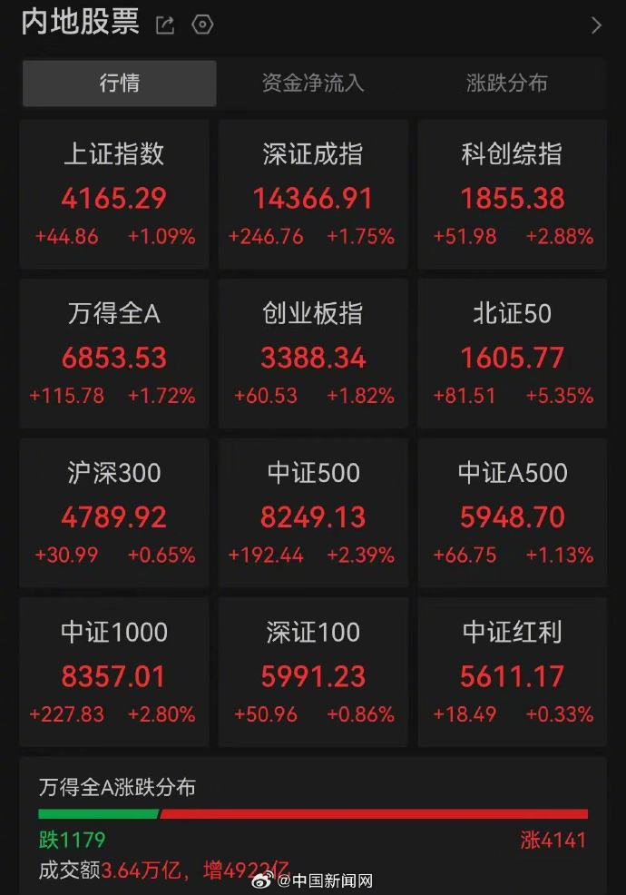 1月12日,A股三大股指集体上涨。截至收盘,沪指涨1.09%报4165.29点,录得17连阳;深成指涨1.75%报14366.91点;创业板指涨1.82%报3388.34点。市场全天成交额约3.64万亿元,打破此前3.49万亿的最高纪录,创历史新高。(记者 谢艺观)