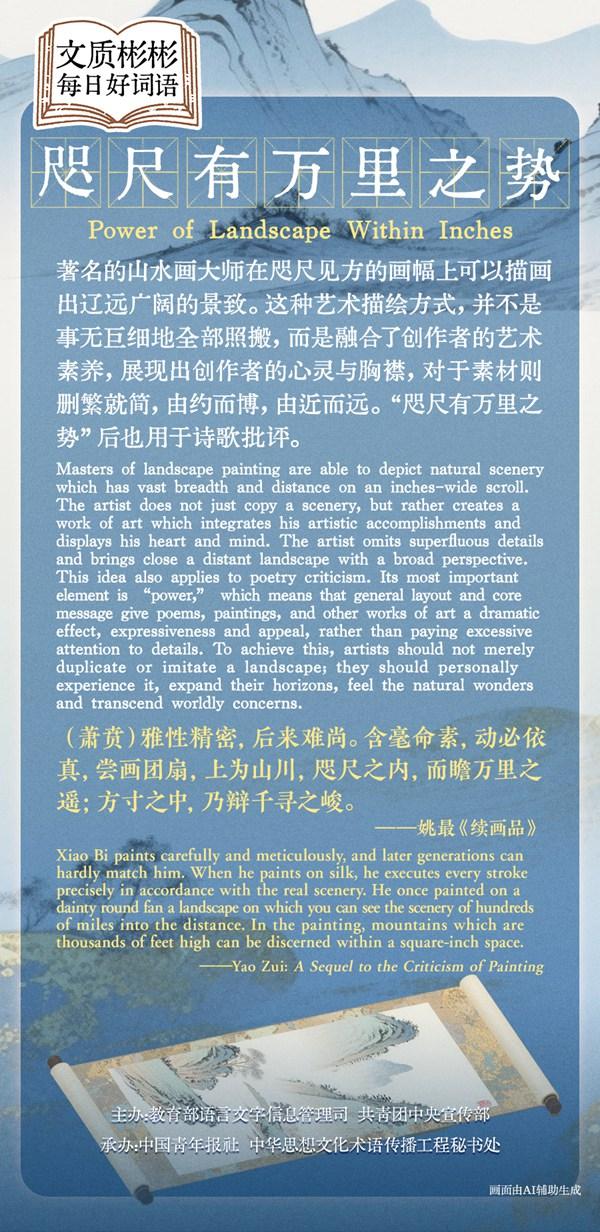 著名的山水画大师在咫尺见方的画幅上可以描画出辽远广阔的景致。这种艺术描绘方式,并不是事无巨细地全部照搬,而是融合了创作者的艺术素养,展现出创作者的心灵与胸襟,对于素材则删繁就简,由约而博,由近而远。“咫尺有万里之势”后也用于诗歌批评。
