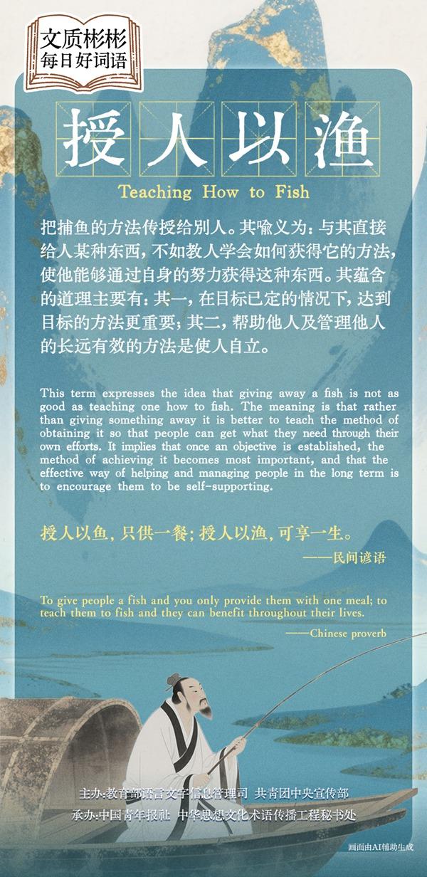 授人以鱼,只供一餐;授人以渔,可享一生。(民间谚语)(给人鱼吃,只能供他一顿;教人捕鱼,可使他受用终身。)