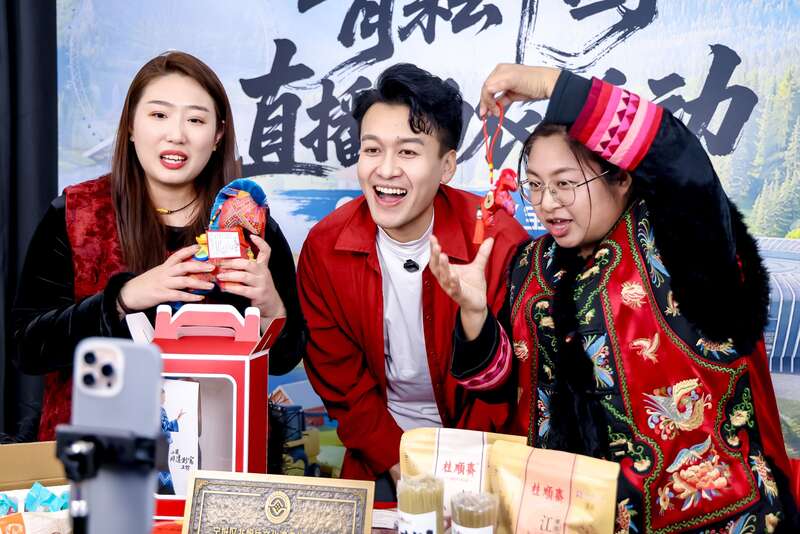 “青耘中国”直播助农活动天津专场直播间,满族百纳拼布技艺非遗代表性传承人钱俊如和主播张凤桐、卢月正在介绍文创摆件。