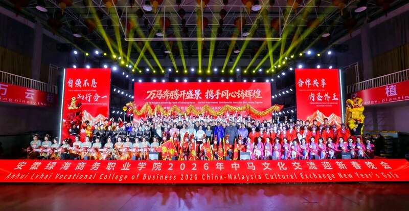 本次晚会由安徽绿海商务职业学院(以下简称“绿海学院”)与马来西亚吉隆坡科技大学共同举办。晚会以“骏马迎春・四海同辉”“大同世界・文明互鉴”“绿海扬帆・出海添彩”“同心致远・共赴辉煌”四大篇章徐徐铺展,节目形式涵盖歌曲、舞蹈、情景剧、花艺、武术等,文化元素交相辉映,尽显两校师生才艺与风采。