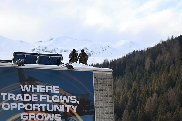 1月19日,瑞士达沃斯,世界经济论坛2026年年会开幕,全副武装的安保人员在酒店屋顶执勤,标语牌上写着“贸易往来之处,机遇蓬勃而生”。视觉中国供图